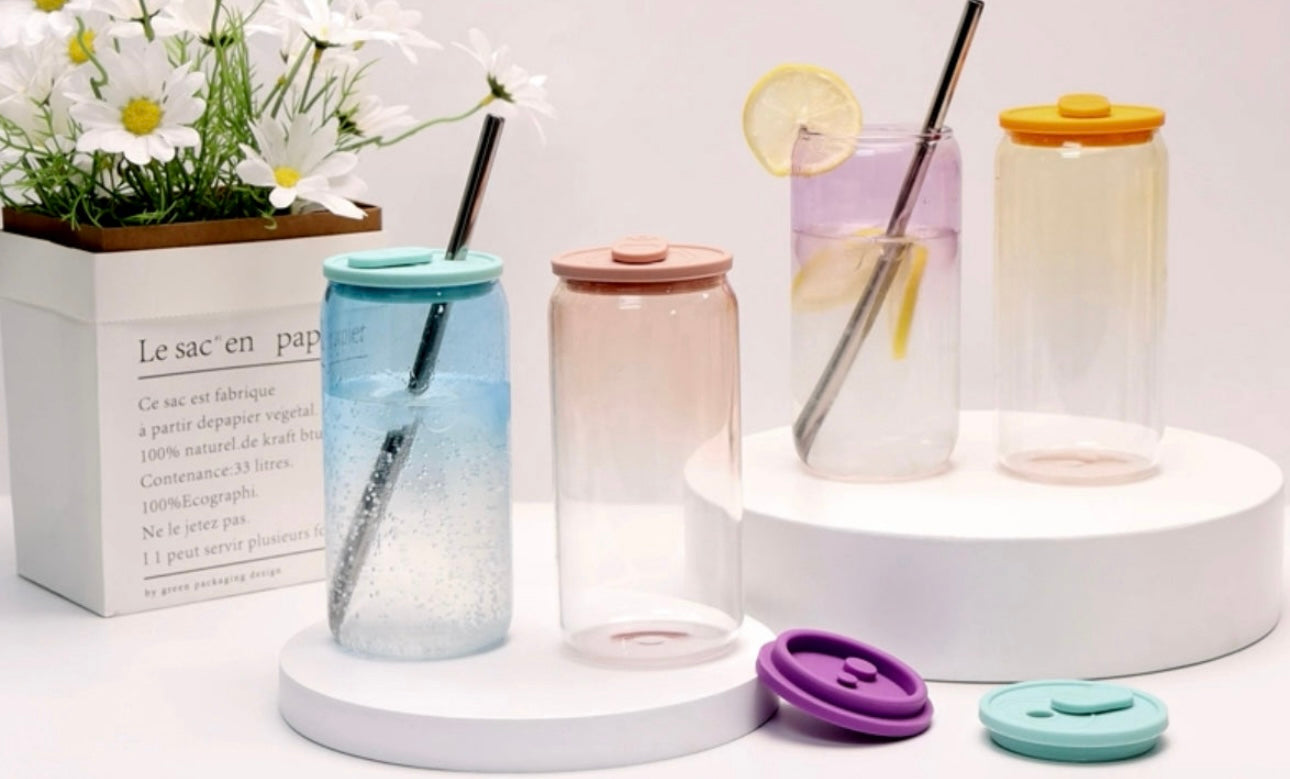 Colorful cups have a silicone lid and matching color straw.